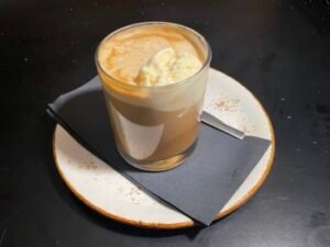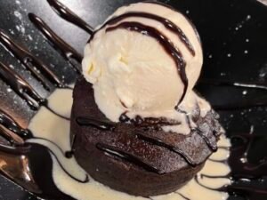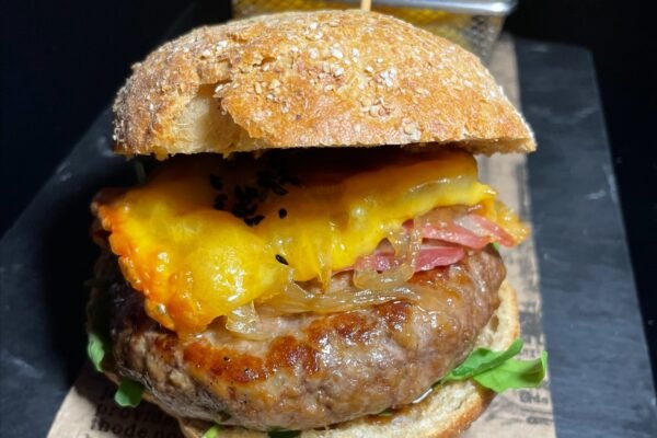 Hamburguesa de Angus, queso cheddar, bacón, cebolla caramelizada, rúcula y salsa barbacoa